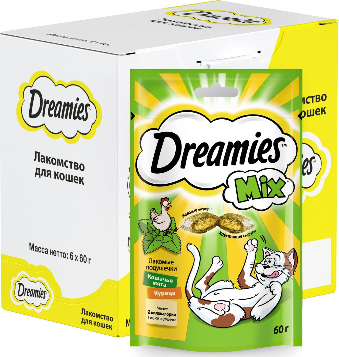 Ни один кот не сможет устоять перед хрустящими подушечками Dreamies™ Mix с кошачьей мятой и курицей!
