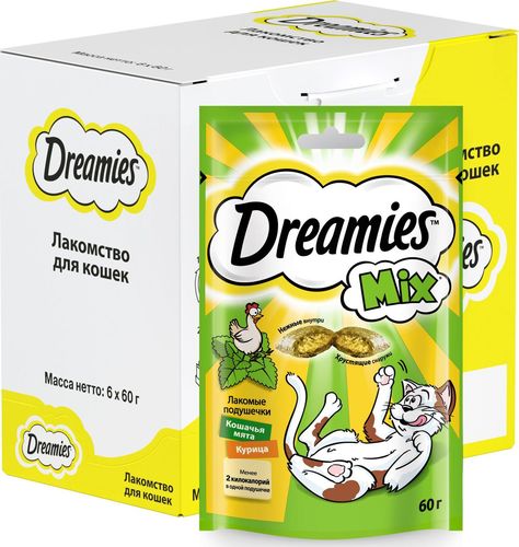 Попробуйте Dreamies™ с курицей, говядиной, сыром, лососем, уткой и микс кошачьей мяты и курицы, чтобы ваш любимец каждый день наслаждался разнообразием вкусов. Ежедневная норма кормления Dreamies™ - до 15 подушек.