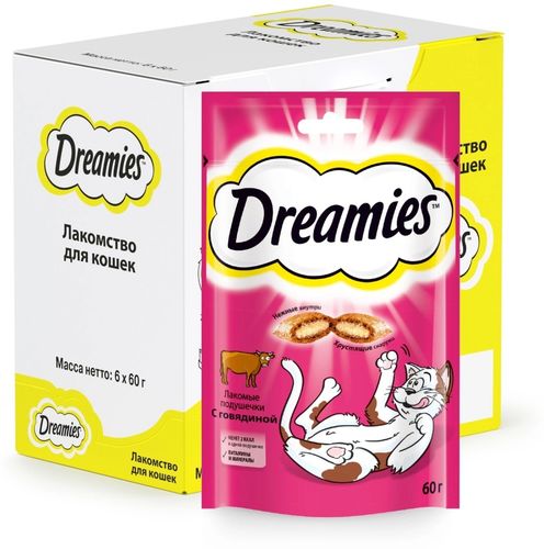 Кошкам нравится разнообразие в питании и сочетание текстур. Именно поэтому ассортимент вкусов, хрустящая текстура снаружи и нежный паштет внутри делают это лакомство необыкновенно вкусным. Вы можете давать лакомство Dreamies каждый раз, когда хотите побаловатьлюбимца. Рекомендуемая дневная порция - 4 подушечки на каждый килограмм веса вашей кошки. В каждом кусочке содержится около двух калорий. Dreamies Лакомые Подушечки предназначены для взрослых кошек.