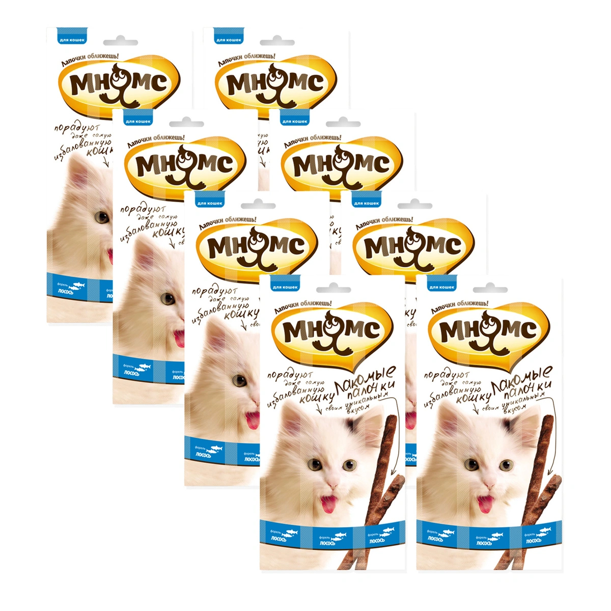 Мнямс лакомые палочки 13,5 см для кошек с лососем и форелью 3х5 г. Мнямс лакомые палочки для кошек с лососем и форелью станут любимым угощением для вашего питомца. Кроме того, что каждая палочка содержит высококачественные морепродукты, в ее состав также входят и продукты растительного происхождения, которые гарантировано подарят кошке здоровый вид.