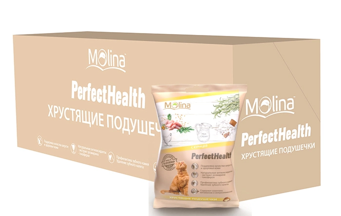 Molina PERFECTHEALTH хрустящие подушечки для кошек - это натуральное и полезное лакомство со вкусом курицы и сливочной начинкой. Лакомство содержит ТАУРИН и микроэлементы для профилактики зубного камня и поддержки качества шерсти. Натуральный и вкусный продукт, без искусственных добавок, красителей, ГМО и усилителей вкуса, идеален для поощрения, игры и перекуса.