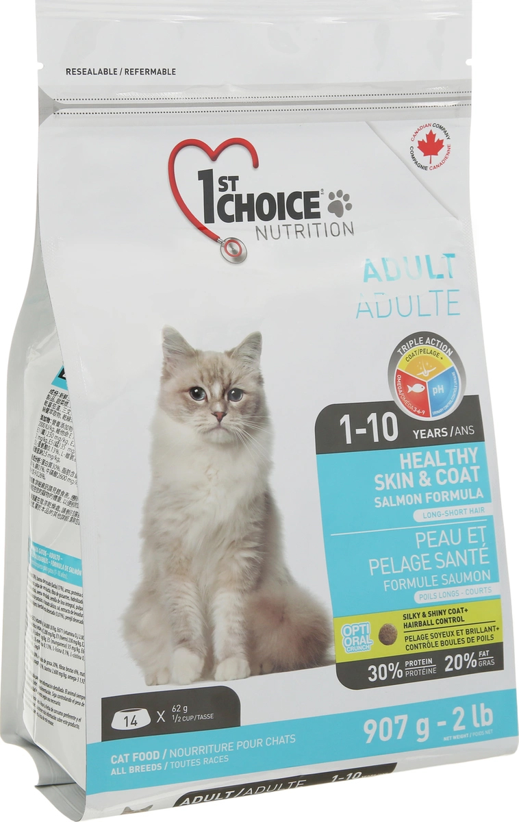 Корм сухой 1st Choice "Здоровая кожа и шерсть" разработан для улучшения состояния кожи и шерсти взрослых кошек в любое время года, шерсть любой длины становится мягкой и блестящей. Жир лосося является лучшим источником Омега 3-6-9 жирных кислот, обеспечивающих здоровье кожи. Сочетание рыбного белка и рыбьего жира гарантирует здоровую и роскошную шерсть. Свежий лосось - главный ингредиент, который понравится даже самым привередливым гурманам.