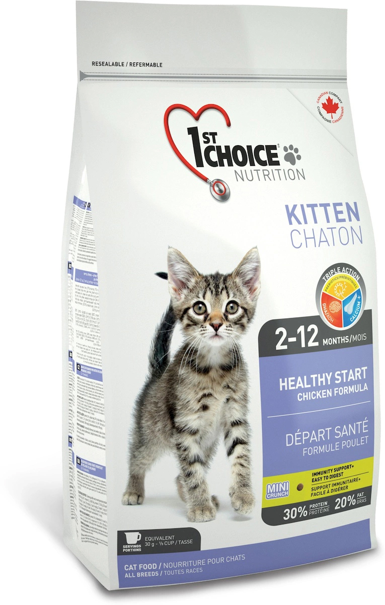 Сухой корм 1st Choice "Здоровый старт" с идеальной формулой для начального прикорма предназначен для котенка с 2 месяцев, когда он нуждается в новых источниках питания вместо материнского молока. При этом нет необходимости разделять котенка с мамой. Корм содержит все необходимое не только для растущего организма, но и для беременных и кормящих кошек. Оптимальное питание для старта в здоровую жизнь! Мелкие гранулы легко усваиваются в организме котенка, укрепляя иммунитет, полученный от матери. Входящий в состав жир лосося - самый лучший источник DHA (докозагексаеновой кислоты), которая обеспечивает оптимальное развитие центральной нервной системы, головного мозга и зрения. Пребиотики поддерживают иммунитет и способствуют хорошему пищеварению, кальций - правильному развитию костной системы котенка. DHA развивает центральную нервную систему, головной мозг и зрение.