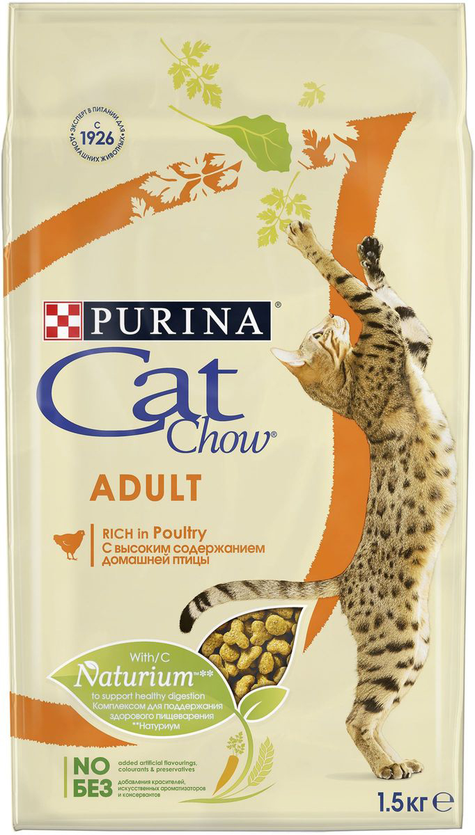 Корм сухой Cat Chow "Adult" - полнорационный, сбалансированный корм, в котором есть все необходимое, чтобы жизнь вашей кошки была здоровой и естественно прекрасной. Корм отличается высоким содержанием домашней птицы и включает Naturium - особое сочетание волокон из натуральных источников, а также источник натурального пребиотика, который поддерживает здоровое пищеварение кошки. Источник высококачественного белка в каждой порции поддерживает оптимальную массу тела. Корм также содержит тщательно отобранные травы и овощи (петрушка, шпинат, морковь). Эти ингредиенты придают особый аромат, который кошки выбирают инстинктивно. Высокое содержание витамина Е улучшает естественную защиту организма кошки. Мякоть свеклы и цикорий поддерживают здоровое пищеварение и уменьшают запах от туалетного лотка.