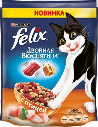 Felix "Двойная Вкуснятина" - новый сухой корм для кошек, который полностью соответствует потребностям вашего озорника. Восхитительное сочетание двух текстур в одной упаковке: хрустящие гранулы смешаны с мягкими кусочками для создания невероятного вкуса, перед которым невозможно устоять. Состав: злаки, мясо и продукты переработки мяса (мин. 4% птицы на базе восстановленного вещества), экстракты растительного белка, животные жиры, глицерин, продукты переработки растительного сырья, минеральные вещества, консерванты, различные сахара, дрожжи, витамины, красители, антиоксиданты.