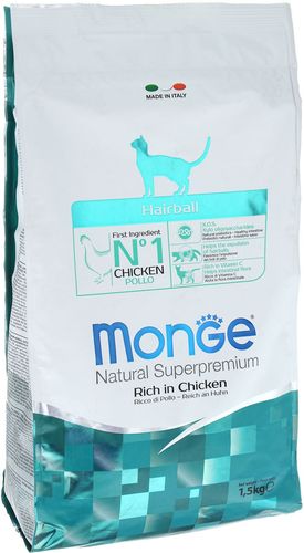 Сухой корм "Monge" - это полноценный корм для взрослых кошек (от 1 года до 10 лет), страдающих от комочков шерсти в желудке, разработан с добавлением растительной клетчатки, помогающей выводить эти комочки из организма. Более того, содержащийся L-карнитин предотвращает накопление жира, защищая печень и сердце, в то время как оптимальное соотношение жирных кислот Омега-3 и Омега-6 является эффективной помощью при воспалениях и предотвращает аллергию. Корм также содержит высокоусваиваемые злаки, помогает поддерживать остроту зрения и здоровое сердце, усиливает иммунную систему и правильное развитие скелета, зубов и суставов.