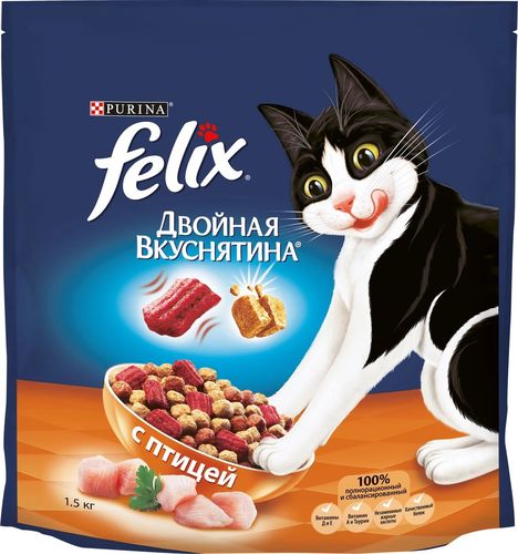 Любопытство вашего кота заложено природой! И бренд Felix(r) снова придумал, как его удовлетворить. Представляем Felix(r) Двойная Вкуснятина(r) – новый сухой корм для кошек, который полностью соответствует потребностям Вашего озорника. Восхитительное сочетание двух текстур в одной упаковке: хрустящие гранулы смешаны с мягкими кусочками для создания невероятного вкуса, перед которым невозможно устоять! Широкий ассортимент позволит коту наслаждаться разнообразием мясных или рыбных вкусов с соблазнительными ароматами. Felix(r) Двойная Вкуснятина(r) - первый сухой корм, созданный под брендом Felix(r) для находчивого кота, который знает толк во вкусной еде. И это еще не все! Корм Felix(r) Двойная Вкуснятина(r) содержит оптимальное сочетание сбалансированных минеральных веществ и витаминов, которые на 100% удовлетворят ежедневные потребности Вашего питомца в правильном питании.