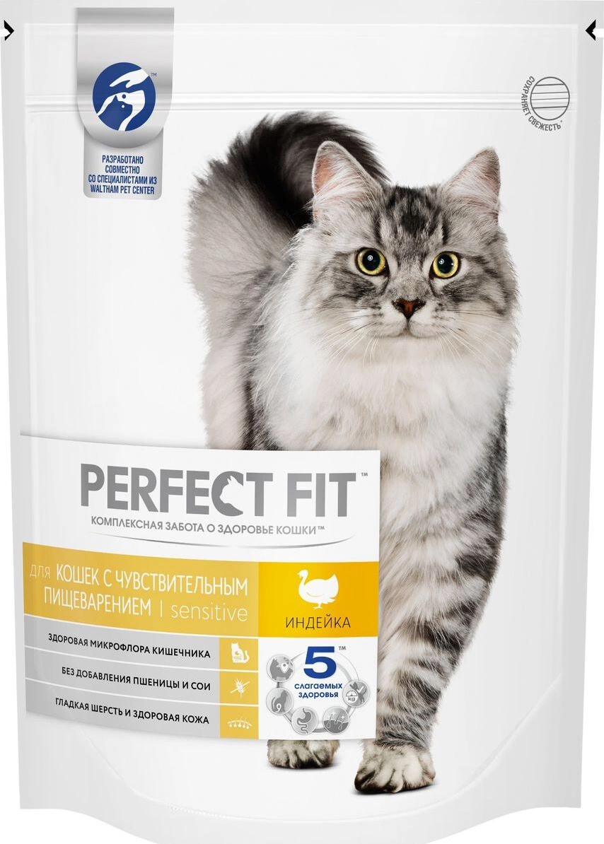 "Perfect Fit" - рацион, адаптированный специально для кошек с особенностями пищеварения. Он содержит пребиотики, способствующие поддержанию здоровой микрофлоры кишечника, и не содержит пшеницы и сои, которые могут вызвать дискомфорт в желудке кошки. Вашу кошку следует кормить кормом комнатной температуры.