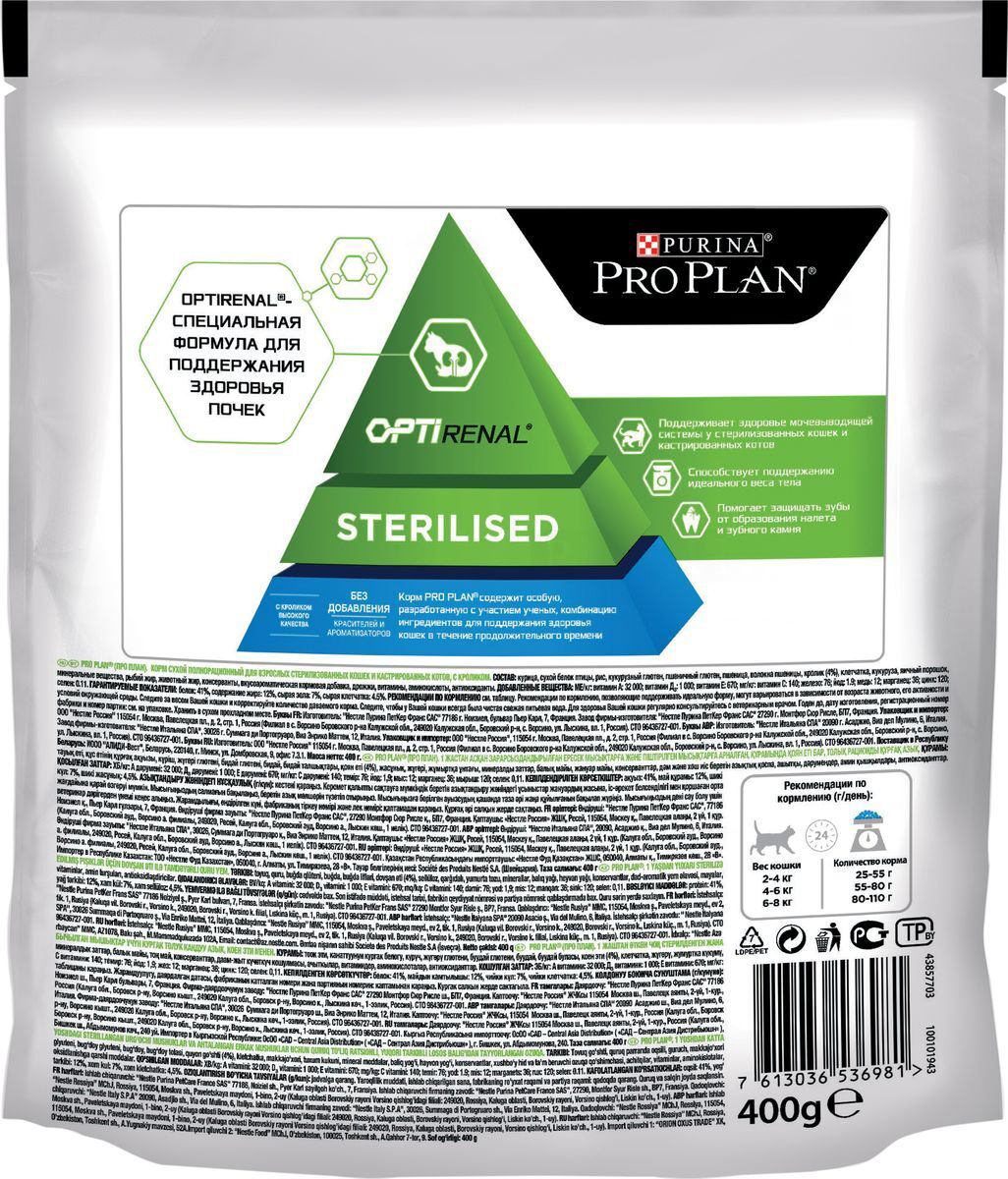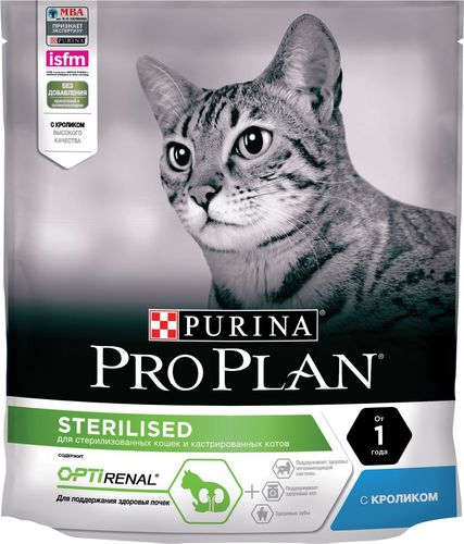 Корм Pro Plan "Sterilised" содержит особую, разработанную с участием ученых, комбинацию ингредиентов для поддержания здоровья кошек в течение продолжительного времени. Pro Plan для стерилизованных кошек и кастрированных котов - корм с высоким содержанием белка и низким содержанием жира, сочетающий все необходимые питательные вещества, включая витамины А, С и Е, а также Омега-3 и Омега-6 жирные кислоты. Обеспечивает pH баланс мочи. Состав: курица, сухой белок птицы, рис, кукурузный глютен, пшеничный глютен, пшеница, пшеничные волокна, кролик (4%), кукуруза, яичный порошок, минеральные вещества, рыбий жир, животный жир, консерванты, витамины, вкусоароматическая кормовая добавка, дрожжи, антиоксиданты.