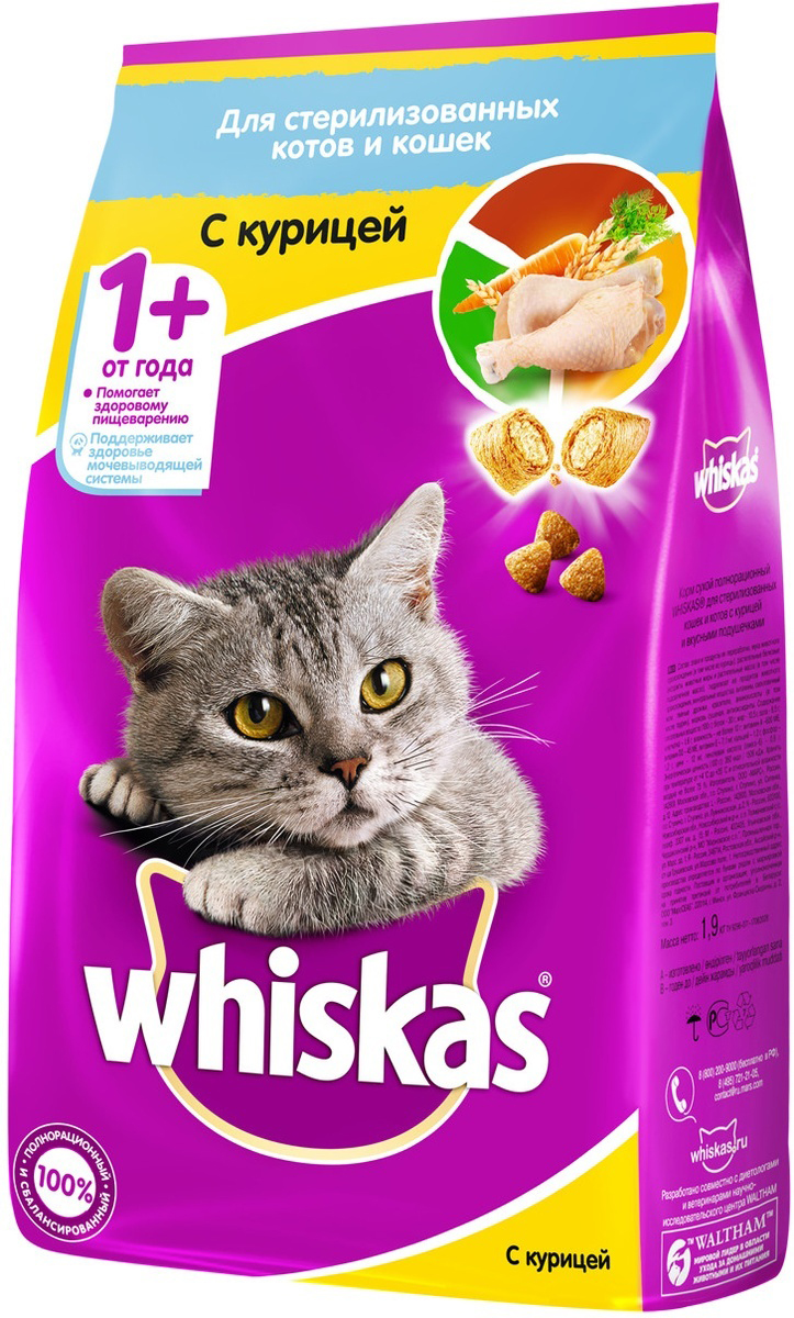 "Whiskas" для стерилизованных кошек и котов - это сбалансированный рацион, который содержит специальный минеральный комплекс, необходимый для здоровья мочевыводящей системы вашей любимицы.