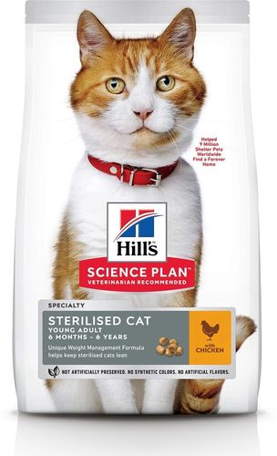 Стерилизованные кошки или кастрированные коты, склонны к набору избыточного веса, поскольку у них увеличивается аппетит и снижается активность. Также у них увеличивается вероятность возникновения проблем с функциями почек и мочевого пузыря. Сухой корм для молодых стерилизованных кошек и кастрированных котов, с курицей Hill's Science Plan Sterilised Cat содержит уникальную формулу контроля веса, поддерживающую идеальный вес, а также сбалансированный набор минералов для поддержания здоровья функций почек и мочевого пузыря.