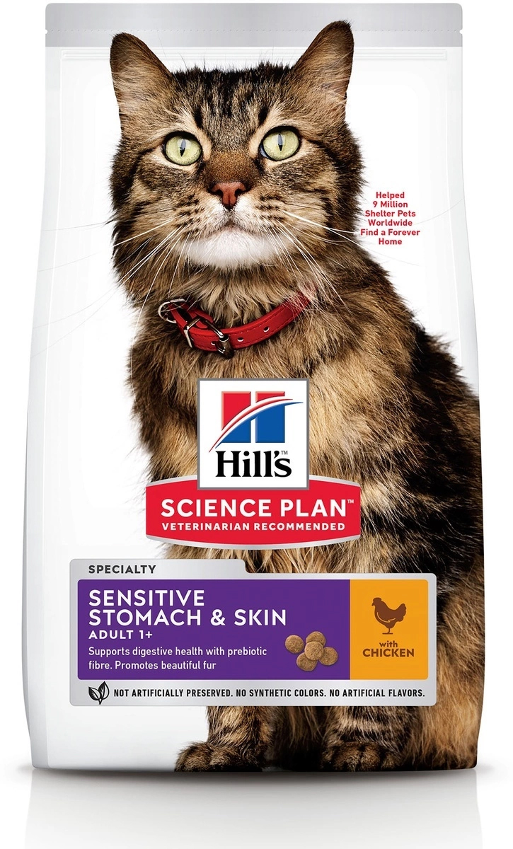 Здоровое пищеварение кошки - важное условие для хорошего самочувствия кошки. Сухой корм для кошек с чувствительным пищеварением и кожей HILL'S SCIENCE PLAN Sensitive Stomach & Skin помогает поддерживать здоровое пищеварение и здоровье шерсти. Корм содержит пребиотические волокна для насыщения полезной микрофлоры и поддержания сбалансированного микробиома кишечника для поддержания здоровья на протяжении всей жизни. Легко усваиваемые ингредиенты способствуют здоровому пищеварению и помогают снизить проблемы со стулом, а Витамин E и Омега-6 жирные кислоты питают кожу и поддерживают здоровье шерсти.Мы с гордостью представляем вам новый образ любимого корма Hill's Science Plan. В некоторых из наших кормов также изменились названия, форма гранул и формулы. ? Сухой корм для взрослых кошек и котов с легко усваеваемыми ингредиентами, для поддержания здорового пищеварения и помощи в решении проблемы со стулом