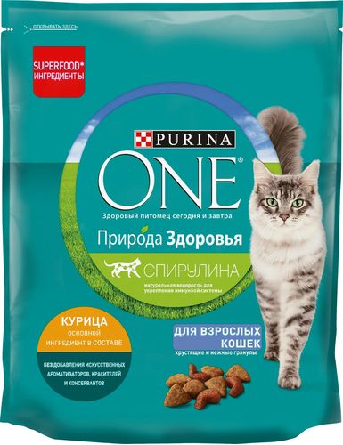 Purina One Природа Здоровья содержит натуральную водоросль спирулину, которая поддерживает природную иммунную систему вашей кошки. А комбинация двух текстур порадует ее превосходным вкусом. Purina One сделан из высококачественных ингредиентов с высоким содержанием курицы и необходимыми питательными веществами.