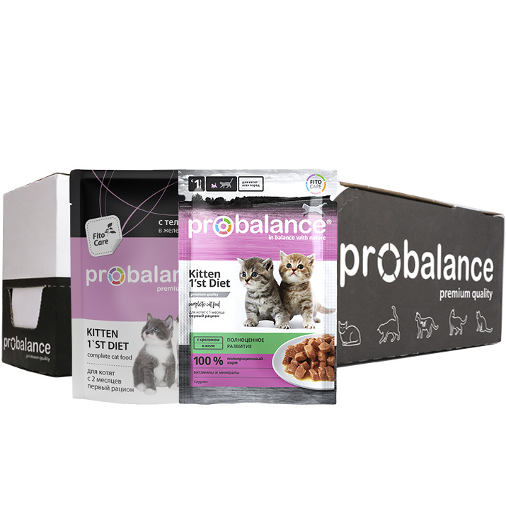 Полнорационный сбалансированный консервированный корм премиум класса. Рекомендован для ежедневного кормления котят с 1-го месяца, а также беременных и кормящих кошек. В наборе 2 упаковки корма: в каждой коробке 25 пакетиков (паучей) по 85 г каждый. 25 шт. с кроликом в желе и 25 шт. телятиной в желе.Корм Probalance разработан практикуюшими датским ветеринарами. В основе консервированного корма Probalance «Kitten 1`st diet» – натуральные мясные ингредиенты. Они богаты витаминами, минералами и микроэлементами, что необходимо для полноценного развития и роста котенка. Природные антиоксиданты, содержащиеся в кусочках мяса, способствуют укреплению иммунитета.