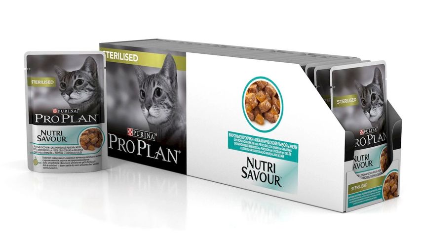 Паучи Purina Pro Plan NutriSavour Sterilised для взрослых стерилизованных (кастрированных) кошек всех пород. Поведение кошек меняется после стерилизации (кастрации), повышается риск увеличения веса, возможны проблемы с мочеполовой системой, поэтому их питание должно соответствовать новым специфическим потребностям. Рацион разработан с учетом количества калорий: пониженное содержание жиров, пониженное содержание углеводов стимулирующих аппетит. Он способствует пищевым потребностям питомца, поддерживает нормальный вес и мышечный тонус.Состав: мясо и продукты переработки мяса (в том числе говядина 4%), экстракты растительных белков, рыба и продукты переработки рыбы (в том числе и океаническая рыба 4%), продукты переработки растительного сырья, растительные и животные жиры минеральные вещества, сахар, витамины, красители, антиоксиданты.