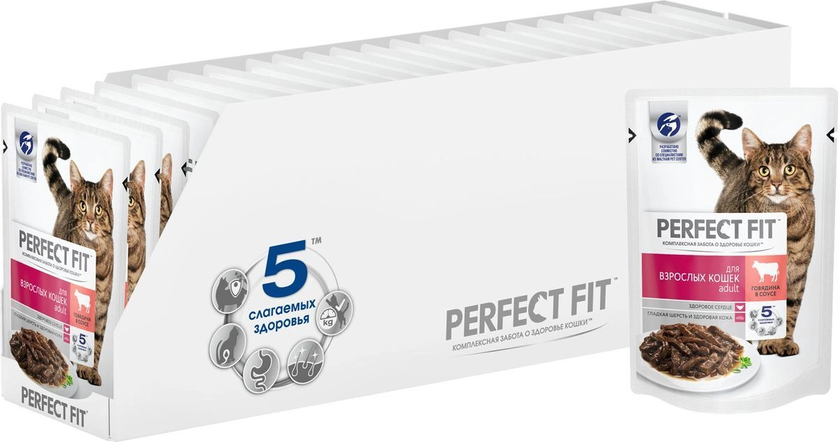 Консервы "Perfect Fit" - консервированный полнорационный корм для взрослых кошек с говядиной в соусе. Корм содержит таурин, незаменимую для кошек аминокислоту, помогающую поддерживать сердце здоровым. Корм также способствует поддержанию здоровья кожи и шерсти благодаря содержанию цинка и подсолнечного масла, натурального источника омега-6 жирных кислот. Корм имеет специальную формулу "5 слагаемых здоровья":