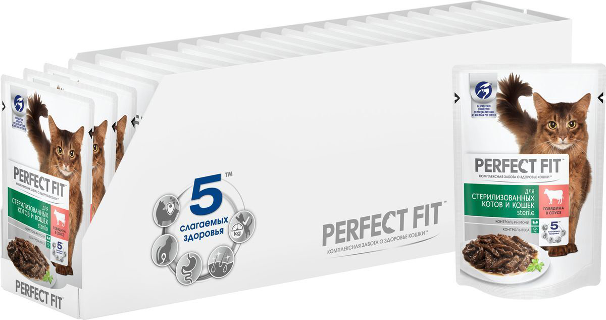 В рационе Perfect Fit Sterile мы учли потребности организма кошки, прошедшей стерилизацию. Специальная рецептура для контроля рН мочи и высокое содержание влаги в составе способствуют поддержанию здоровья мочевыводящих путей, а сниженный уровень жиров и особые рекомендации по кормлению позволят следить за оптимальным балансом веса. Вашу кошку следует кормить кормом комнатной температуры.Для взрослой кошки среднего веса (4кг) необходимо 3-4 пакетика в день.