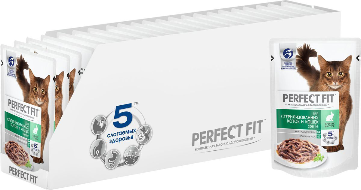 В рационе Perfect Fit Sterile мы учли потребности организма кошки, прошедшей стерилизацию. Специальная рецептура для контроля рН мочи и высокое содержание влаги в составе способствуют поддержанию здоровья мочевыводящих путей, а сниженный уровень жиров и особые рекомендации по кормлению позволят следить за оптимальным балансом веса. Вашу кошку следует кормить кормом комнатной температуры.Для взрослой кошки среднего веса (4кг) необходимо 3-4 пакетика в день.