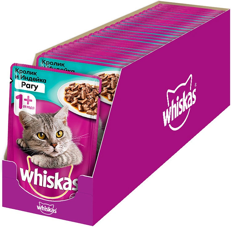 Whiskas - это разнообразие вкусных и сбалансированных блюд, которые уже заслужили любовь кошек и доверие хозяев. Сочное рагу, нежный паштет или аппетитное желе идеально подходят на каждый день, ведь в них содержатся на 100% натуральные ингредиенты, а также витамины и минералы для здоровья вашей любимицы. Рацион сбалансирован. Поддержание иммунитета. Здоровье кожи и шерсти. Без добавления консервантов.Состав: мясо и субпродукты (в том числе кролик и индейка), злаки, минеральные вещества, витамины, туарин.