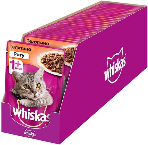 Whiskas - это разнообразие вкусных и сбалансированных блюд, которые уже заслужили любовь кошек и доверие хозяев. Сочное рагу, нежный паштет или аппетитное желе идеально подходят на каждый день, ведь в них содержатся на 100% натуральные ингредиенты, а также витамины и минералы для здоровья вашей любимицы. Рацион сбалансирован. Поддержание иммунитета. Здоровье кожи и шерсти. Без добавления консервантов.Состав: мясо и субпродукты (в том числе телятина), злаки, минеральные вещества, витамины, туарин.