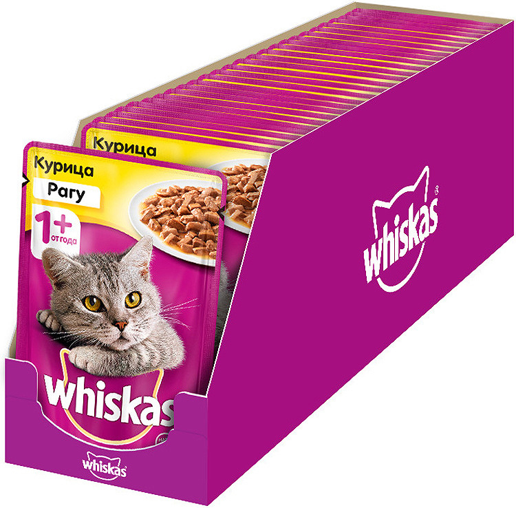Whiskas - это разнообразие вкусных и сбалансированных блюд, которые уже заслужили любовь кошек и доверие хозяев. Сочное рагу, нежный паштет или аппетитное желе идеально подходят на каждый день, ведь в них содержатся на 100% натуральные ингредиенты, а также витамины и минералы для здоровья вашей любимицы. Рацион сбалансирован. Поддержание иммунитета. Здоровье кожи и шерсти. Без добавления консервантов.Состав: мясо и субпродукты (в том числе курица), злаки, минеральные вещества, витамины, туарин.