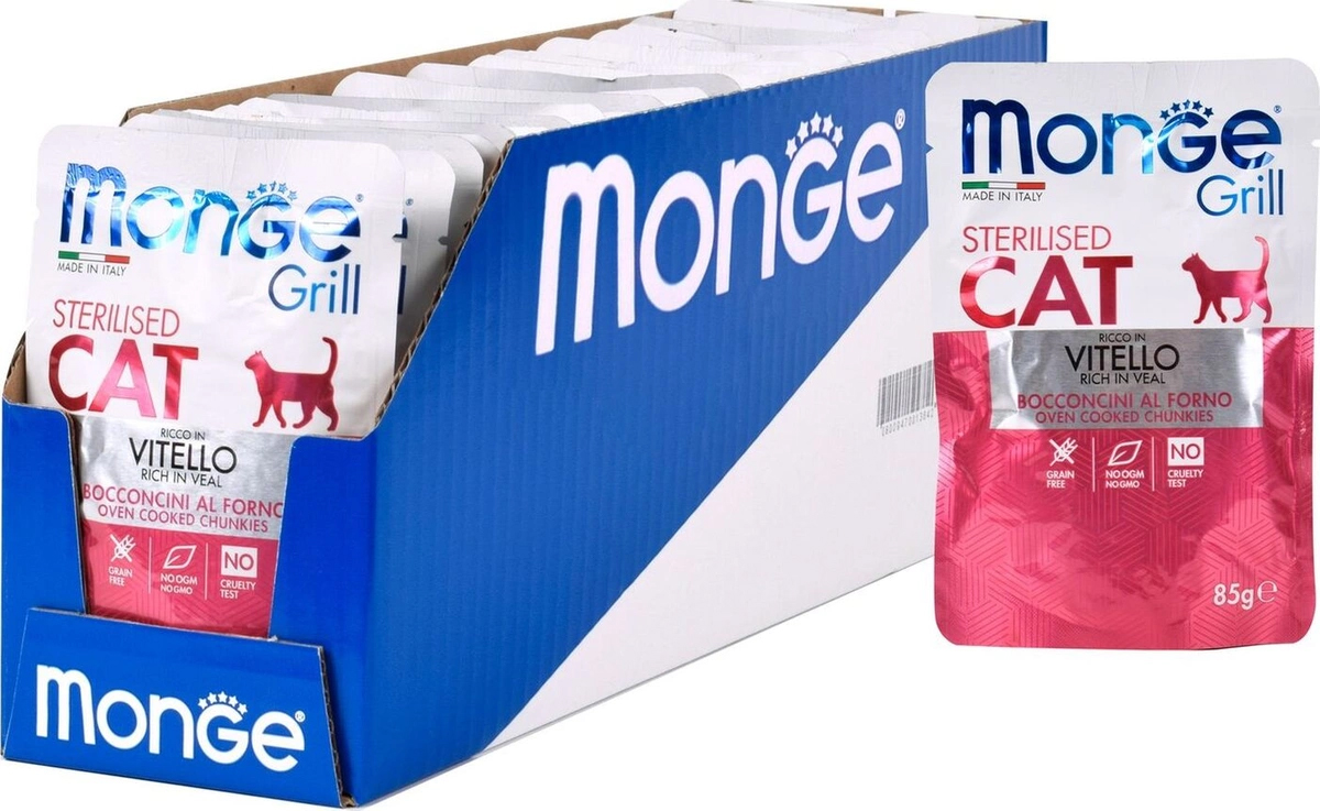 Полнорационный консервированный корм кусочки в желе на основе итальянской телятины для стерилизованных кошек.