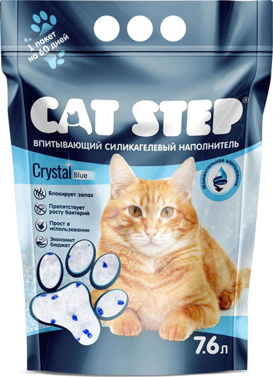Cиликагелевый наполнитель для кошачьего туалета CAT STEP Crystal Blue с добавлением синих кристаллов моментально впитывает влагу и уничтожает запахи.