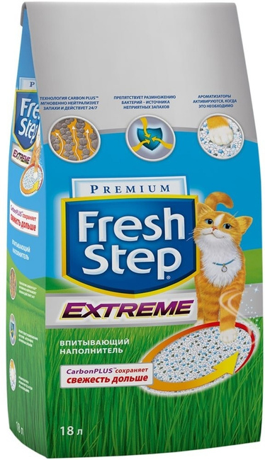 Fresh Step® Extreme - премиальный впитывающий наполнитель для кошачьего туалета, который производится из высококачественной светло-серой глины эксклюзивно для Fresh Step®. Легкая глина, улучшенная благодаря активным ингредиентам, обеспечивает превосходное впитывание и нейтрализацию неприятных запахов, тем самым минимизируя расход наполнителя.