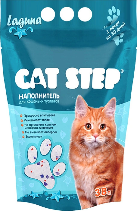 Cиликагелевый наполнитель для кошачьего туалета CAT STEP Crystal Laguna с добавлением синих и розовых кристаллов моментально впитывает влагу и уничтожает запахи.