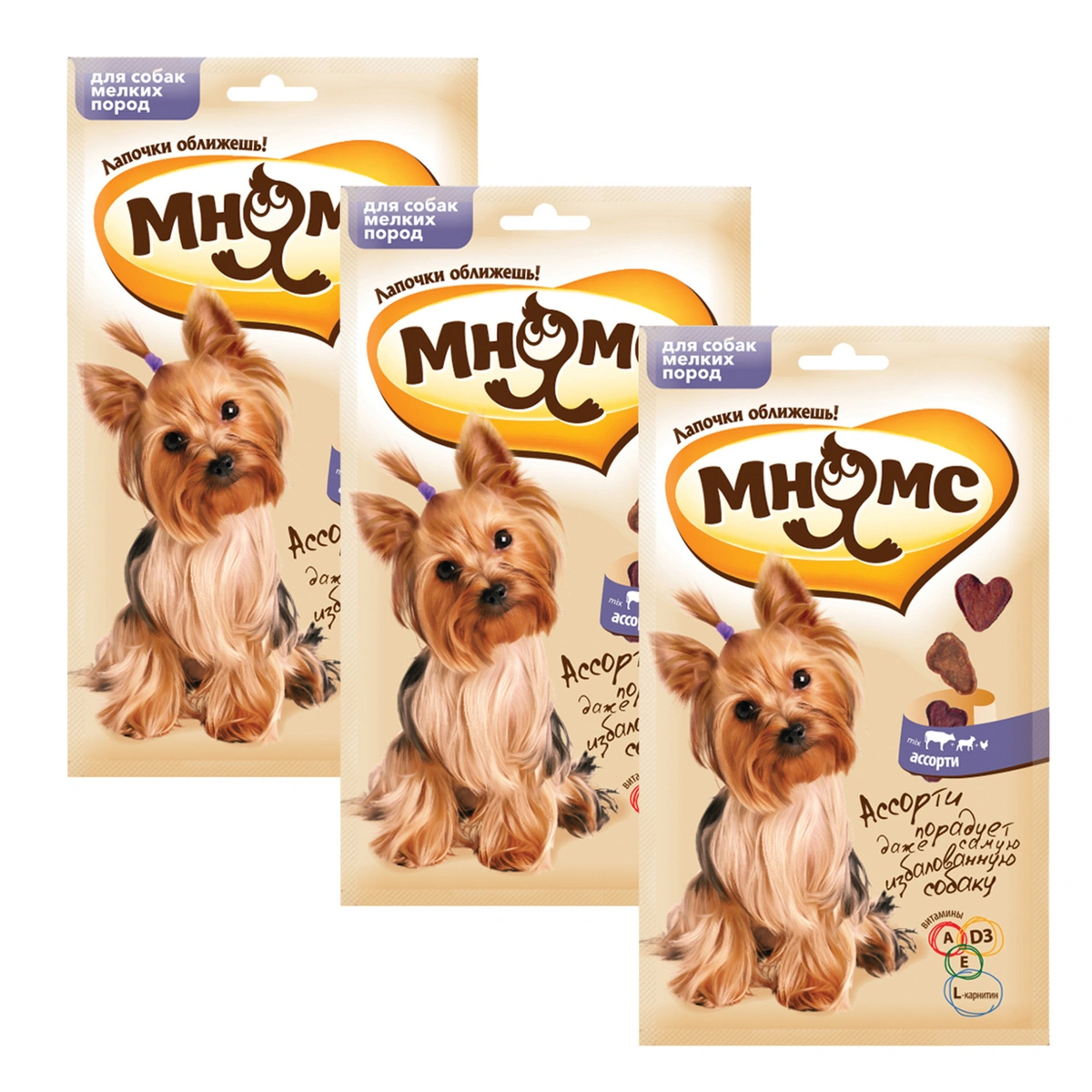 Мнямс ассорти для собак мелких пород говядина, ягненок, курица. Ассорти "Мнямс"- это вкусное и здоровое лакомство с большим содержанием мяса, специально созданное для собак мелких пород. Ассорти состоит из мягких лакомых кусочков разной формы со вкусами говядины, ягненка и курицы, которые придутся по вкусу даже самому капризному любимцу. Лакомство идеально подходит в качестве поощрения для игр и тренировок. Норма употребления: Давать в виде дополнения к основному питанию. Щенкам, начиная с 4-х месяцев – 2-5 кусочков в день; взрослым собакам 5-10 кусочков в день (в зависимости от размера и активности собаки). Свежая вода должна быть всегда доступна вашему питомцу.