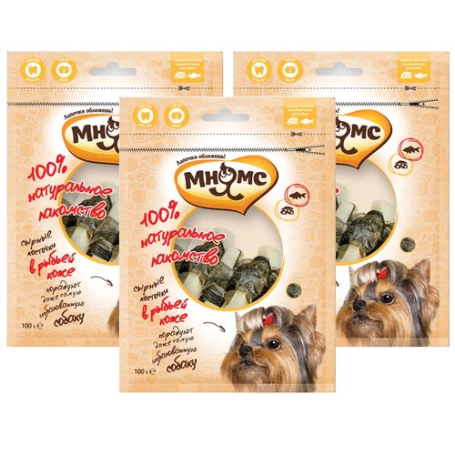 Сырные косточки "Мнямс" - это оригинальное лакомство в ароматной рыбьей коже. Благодаря своей структуре они способствуют снятию зубного камня. Вкусное и здоровое угощение идеально подходит в качестве поощрения для игр и тренировок.