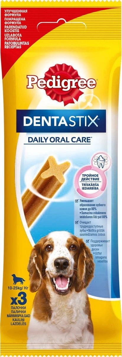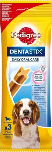 Лакомство Pedigree "Denta Stix" подходит для собак средних пород старше 4-х месяцев. Для собак средних пород, например, кокер-спаниель - одна палочка в день. Предназначено для собак весом 10-25 кг. Благодаря х-образной форме и специальной текстуре, регулярное употребление Denta Stix помогает уменьшить образование зубного камня на 80% и обеспечивает уход за зубами. В упаковке - 3 палочки.