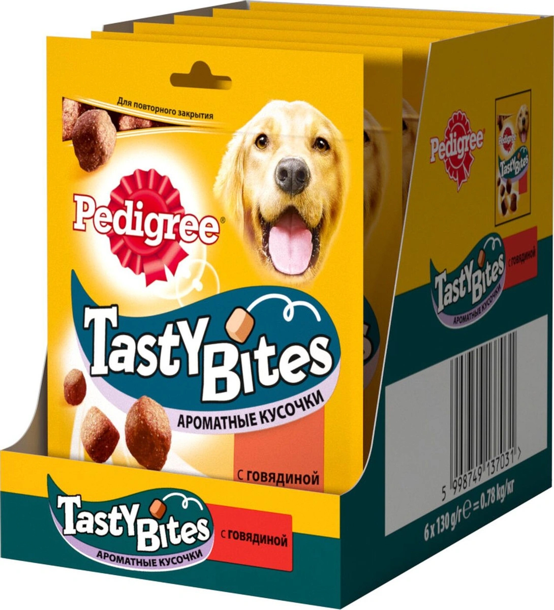 Ароматные кусочки Pedigree Tasty Bites с говядиной — отличное угощение в любое время.Аппетитные маленькие ломтики идеально подходят, чтобы побаловать вашего любимца. В состав Pedigree Tasty Bites входит кальций, который поддерживает здоровье костей, витамины, обеспечивающие естественную защиту, и омега 3 для активной жизни вашего любимца.
