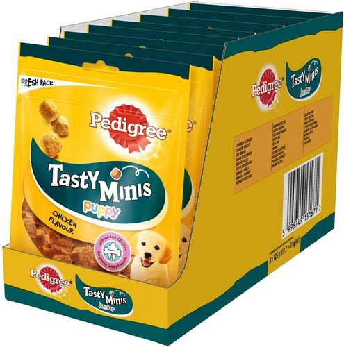 Ароматные кусочки PEDIGREE Tasty Minis с курицей идеально подходят, чтобы баловать, тренировать и поощрять щенка в любое время. Маленькими кусочками PEDIGREE Tasty Minis вашему щенку так удобно лакомиться! В их состав входит кальций для укрепления зубов и костей, диетические пищевые волокна для поддержания здорового пищеварения, комплекс витаминов и минералов для обеспечения природной защиты организма и омега 3 для активной жизни вашего любимца. Упаковку PEDIGREE Tasty Minis с замком можно открывать и закрывать когда удобно.Щенки миниатюрных пород (2-3кг) - не более 8 штук в день, щенки маленьких пород (4-9кг) - не более 14 штук в день, щенки средних пород (10-15кг) - не более 41-ой штуки в день, щенки средних и крупных пород (15-24кг) - не более 56 штук в день, щенки крупных пород (больше 25кг) - не более 81 штук в день. Необходимо уменьшать суточную норму кормления, соответственно. У собаки постоянно должна быть свежая питьевая вода. Подходит для щенков в возрасте от 4-х до 18-ти месяцев.