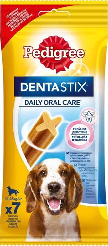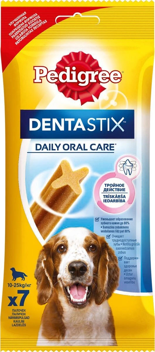Собакам необходим ежедневный уход за полостью рта. Pedigree "Denta Stix" - это вкусное лакомство на каждый день, которое не только очищает зубы, но и укрепляет десны и освежает дыхание. Благодаря своей уникальной форме, Pedigree "Denta Stix" уменьшит у вашего любимца зубной камень до 80%. "Denta Stix" - это уникальная возможность ухаживать за зубами собаки во время еды. Структура Pedigree "Denta Stix" имеет Х-образный профиль. Чтобы разжевать косточку, собака должна прилагать усилия, что помогает удалить налет. Pedigree "Denta Stix" разжевываются в течение довольно долгого времени. Дополнительное преимущество продолжительного жевания состоит в том, что оно стимулирует выделение слюны. Слюна помогает вымывать остатки пищи и удалять их с зубов.