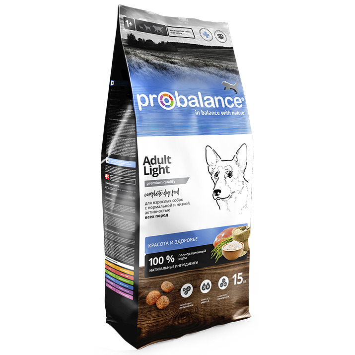Полнорационный натуральный сухой корм премиум класса для собак с избыточным весом или низкой активностью. Корм рекомендован для ежедневного кормления взрослых собак всех пород. Корм Probalance Adult Light разработан датскими ветеринарами. Баланс питательных веществ способствует снижению веса у собак с массой тела выше нормы и помогает поддерживать идеальный вес у собак с нормальной или низкой активностью.