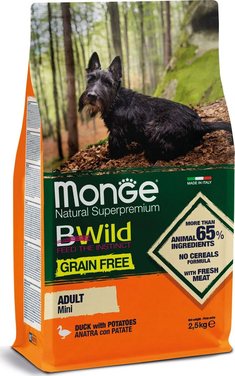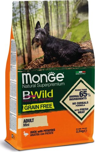 Полнорационный корм для взрослых собак мелких пород с уткой и картофелем не содержит зерновых культур, 2,5 кг. Появление линии кормов Grain Free было обусловлено идеей создания для собак рациона питания, аналогичного тому, которое получали их неодомашненные предки, получавшие высокобелковую пищу и не употреблявшие зерновые продукты.