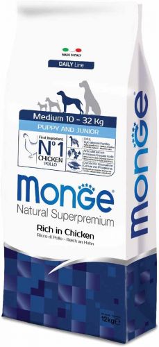 Monge Dog Medium корм для щенков средних пород, 12 кг. Полнорационный корм для собак на основе мяса цыпленка и риса. Рекомендуется для щенков и молодых собак средних размеров возрастом до 12 месяцев, а также для беременных и кормящих самок. Анализ компонентов: сырой белок 29,00%, сырые масла и жиры 18,00%, сырая клетчатка 2,00%, сырая зола 7,50%, кальций 1,50%, фосфор 1,00%, омега-6 жирные кислоты 5,20%, омега-3 жирные кислоты 0,80%.