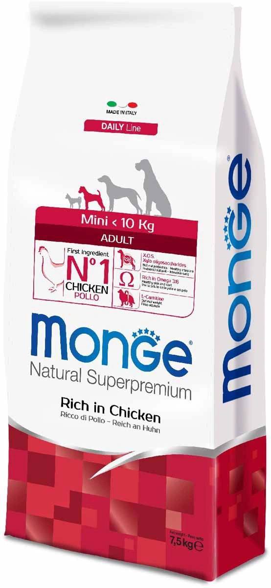 Monge Dog Mini корм для взрослых собак мелких пород, 7,5 кг.Анализ компонентов: сырой белок 26,00%, сырые масла и жиры 14,00%, сырая клетчатка 2,50%, сырая зола 6,00%, кальций 1,20%, фосфор 0,80%, омега-6 жирные кислоты 6,40%, омега-3 жирные кислоты 0,70%.