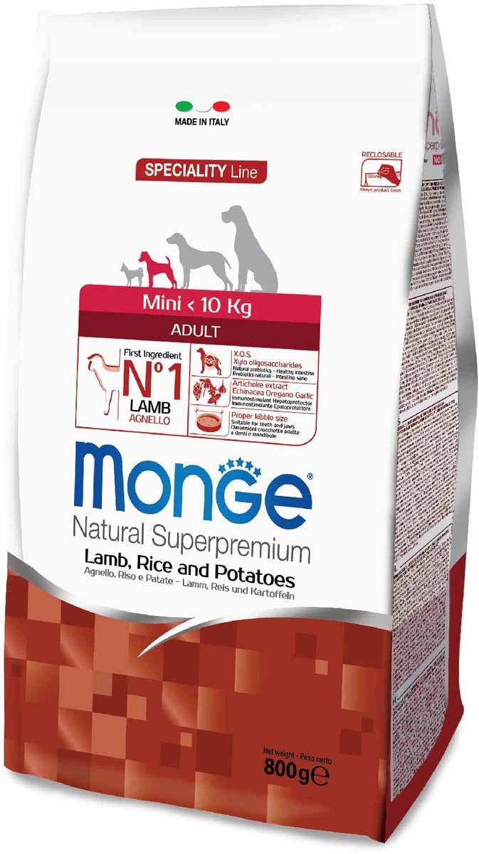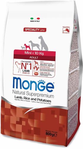 Monge Dog Speciality корм для собак всех пород, ягненок с рисом и картофелем, 800 г. Полнорационный корм для взрослых собак всех пород с ягненком, рисом и картофелем. Идеально подходит для собак, нуждающихся в питании с низким содержанием холестерина. Ингредиенты, входящие в состав, помогают бороться с аллергическими реакциями и воспалениями и подходит для собак с проблемами пищеварения. Входящие в состав ФОС (фруктоолигосахариды) поддерживают здоровую микрофлору кишечника.