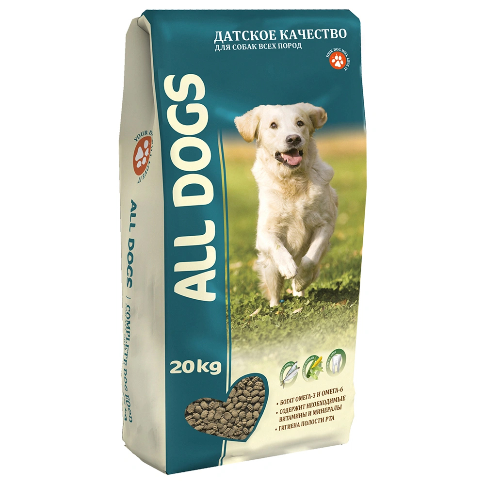 ALL DOGS - это полнорационный корм для собак всех пород. Он разработан на основе результатов последних исследований в области питания домашних животных, а также с учетом требований международных стандартов. ALL DOGS идеально подходит в качестве полноценного питания, поскольку содержит жизненно важные витамины и минеральные вещества. Жирные кислоты Омега-3 и Омега-6, содержащиеся в составе, необходимы для здоровой кожи и красивой шерсти. ALL DOGS обладает вкусом, который сразу понравится собаке. А хрустящие гранулы специальной формы обеспечивают хорошую гигиену полости рта.