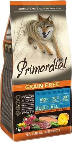 "Primordial" полноценный беззерновой сухой корм для взрослых собак класса холистик. Специально отобранные виды мяса и рыбы поддерживают низкий гликемический индекс, гарантируют высокую аппетитность и переваримость корма. Состав: свежая форель (35%), дегидрированное утиное мясо (25%), горошек, картофель, куриный жир (10%), боб обыкновенный, льняное семя (2,5%), сушеная мякоть свеклы, пивные дрожжи, мука из морских водорослей (0,3%), фруктолигосахариды FOS (0,2%), дрожжевые продукты (MOS 0,2%), юкка Шидигера (0,03%), порошок корня одуванчика (Taraxacum officinale W.) (0,02%), дегидрированный гранат (Punica granatum) (0,02%), дегидрированный стебель ананаса (Ananas sativus L.) (0,02%), дегидрированные плоды шиповника (Rosa Canina L., R. Pendulina L.) (0,002%), глюкозамина, хондроитина сульфат, экстракт розмарина.