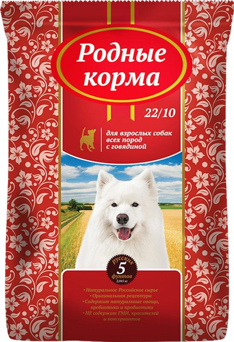 Родные корма для собак 22/10 ГовядинаИнгредиенты: мука из мяса (говядины не менее 14%, курицы 8%) кукуруза, пшеница, жир куриный, диетические волокна, дрожжи, пробиотический комплекс: Bacillus subtillis, Bacillus licheniformis, тыква сушенная, яблоки сушенные, лизин, DL-метионин, минеральные вещества, антиоксиданты, комплекс витаминов.