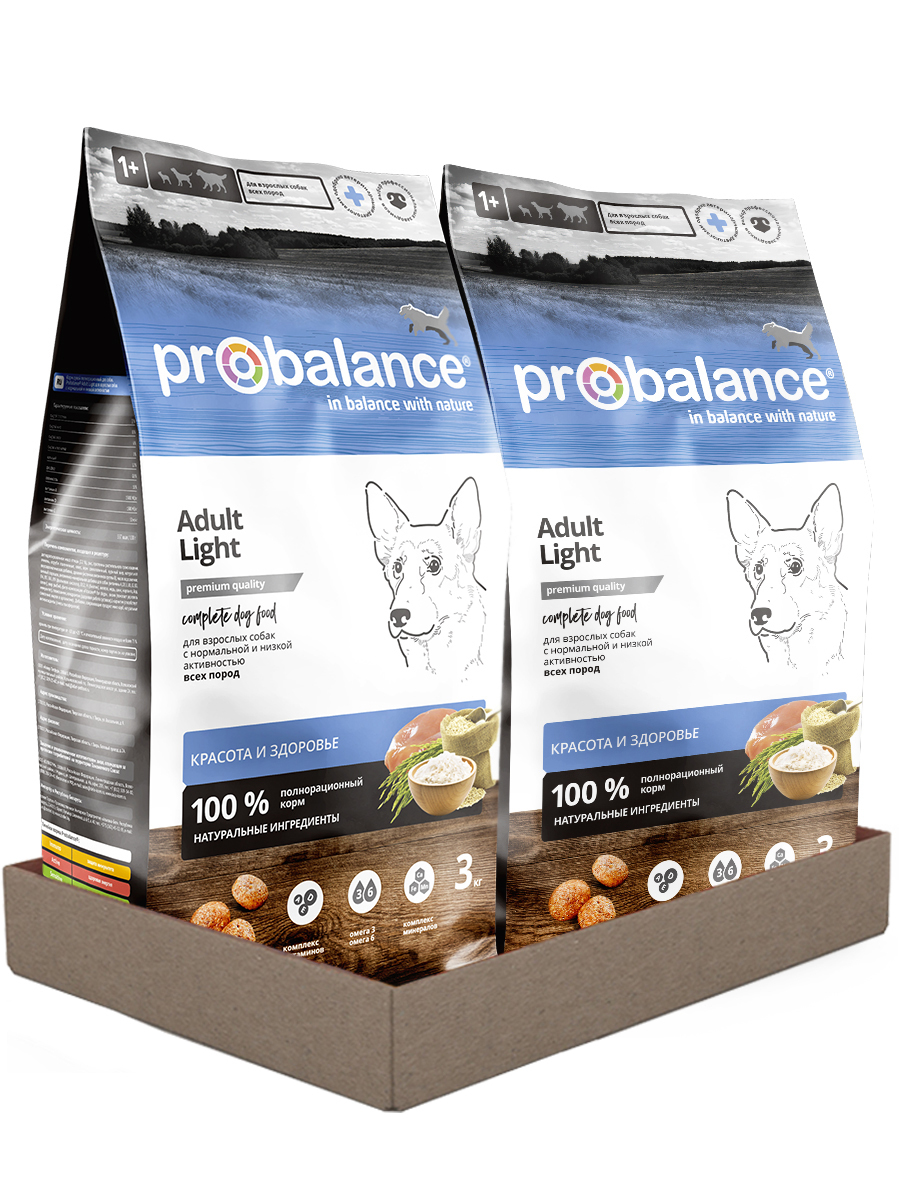 Корм Probalance Adult Light разработан датскими ветеринарами. Баланс питательных веществ способствует снижению веса у собак с массой тела выше нормы и помогает поддерживать идеальный вес у собак с нормальной или низкой активностью.