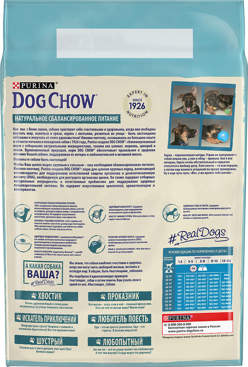 Сухой корм Purina Dog Chow для щенков крупных пород до 2 лет, с индейкой. Придерживайтесь норм, рекомендованных в таблице, и не перекармливайте щенка, чтобы в процессе роста ваш питомец оставался в оптимальной физической форме. МЕ/кг: витамин А: 22 600, витамин D3: 1 300, витамин Е: 105.