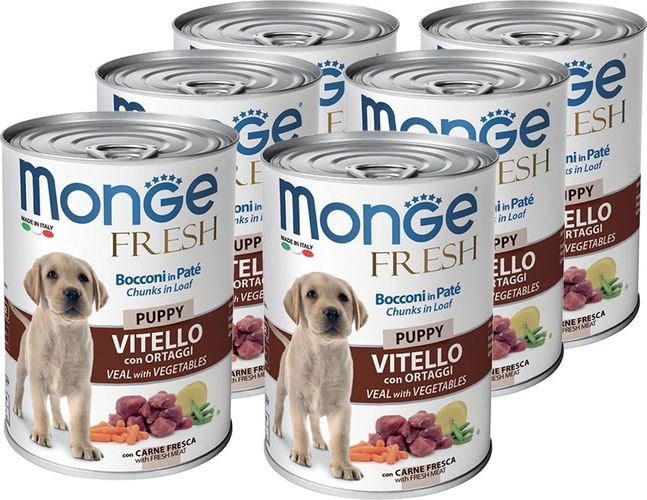 Monge Dog Fresh Chunks in Loaf консервы для щенков мясной рулет с кусочками телятины и овощами 400гПолнорационный корм для щенков.