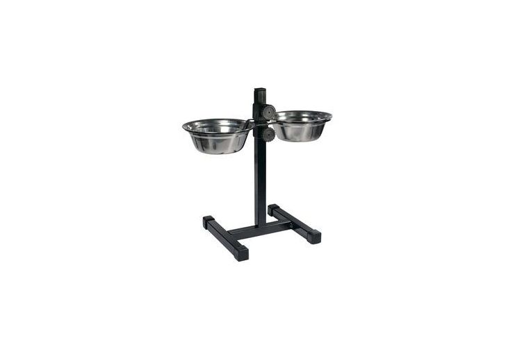 Кормушка состоит из Н-образного основания, штока высотой 40см и держателя для 2-х мисок объемом 0,7л каждая, миски изготовлены из нержавеющей стали. Кормушка легко собирается путем соединения основания и штока винтом при помощи шлицевой отвертки. Основание кормушки имеет резиновые заглушки, которые препятствуют скольжению по глянцевой поверхности, держатель для мисок имеет свободную регулировку мисок по высоте и их фиксацию при помощи специального фиксатора. Идеально подойдет для маленьких собак.