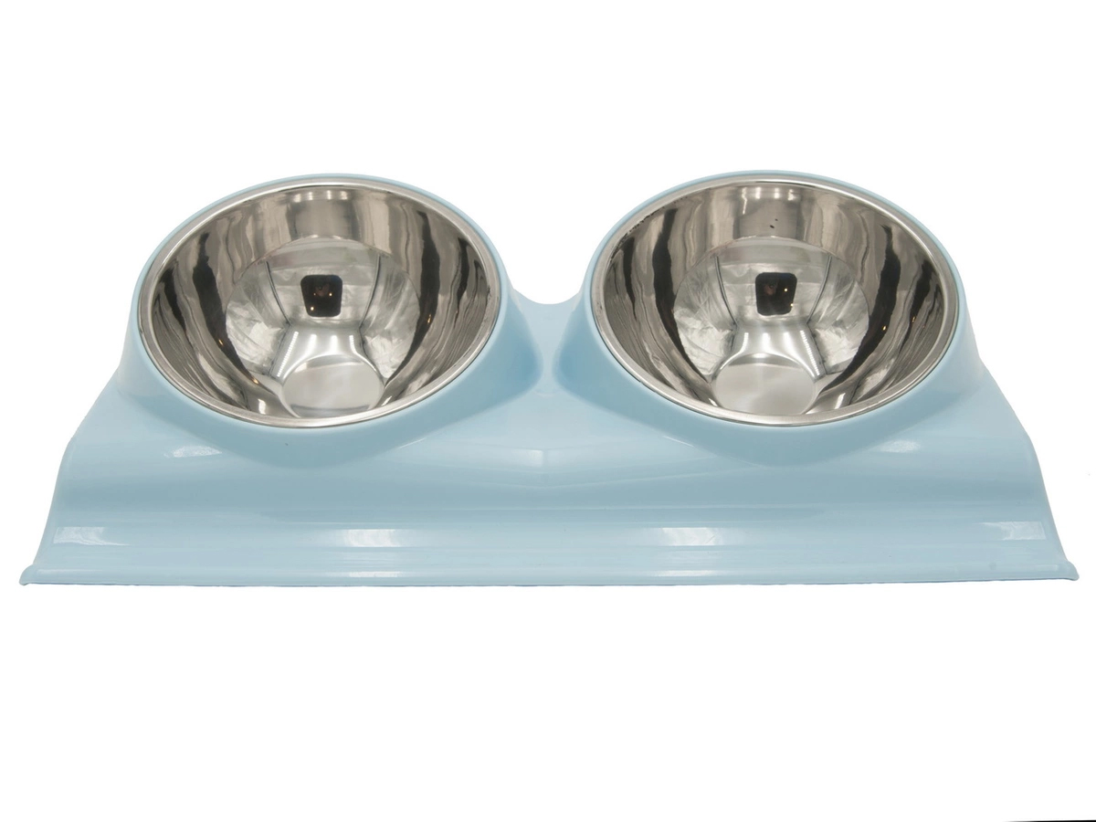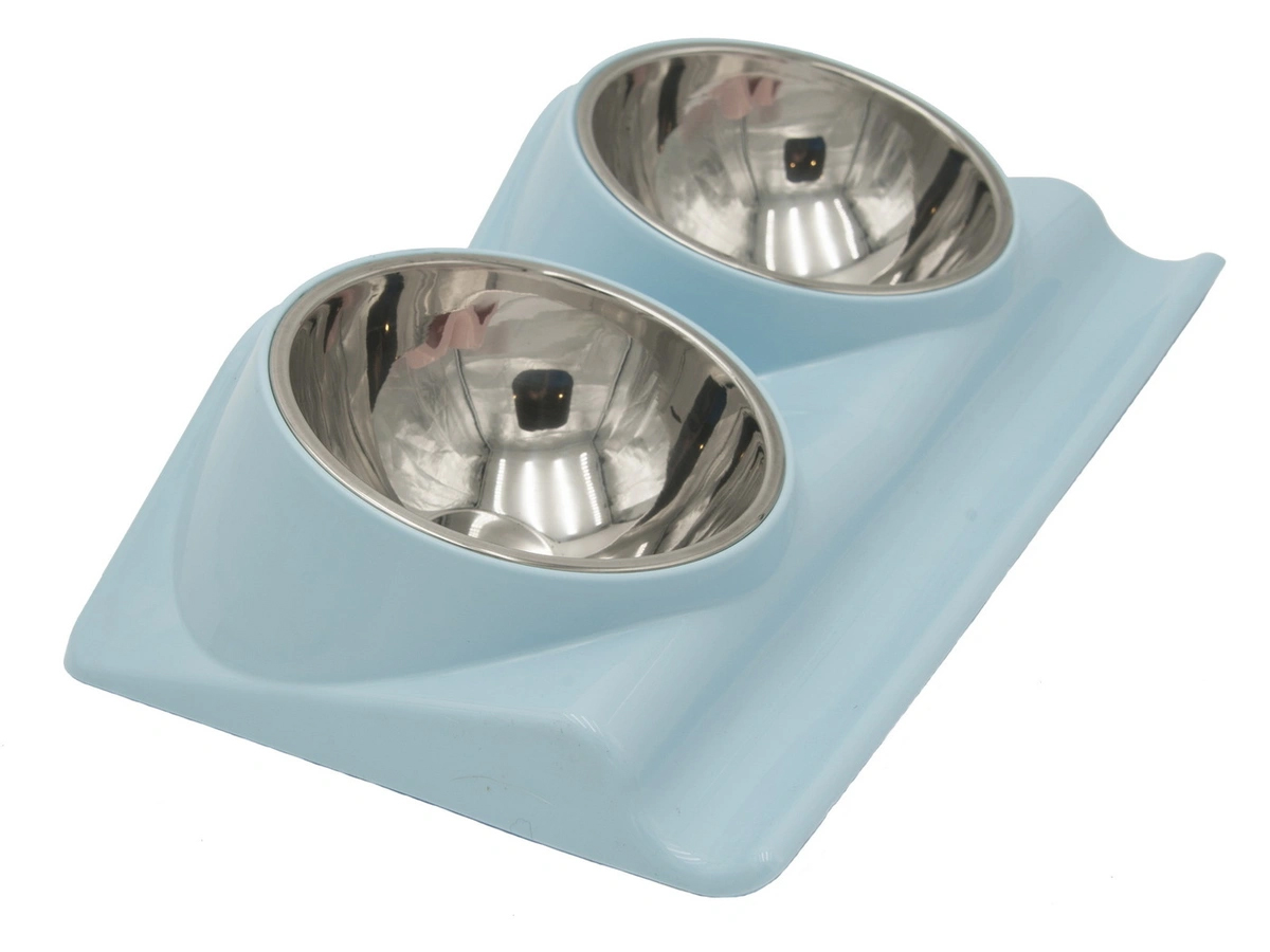 Двойная миска для животных. Основание из формованного полипропилена и съемные миски из нержавеющей стали. Угол наклона в 15 градусов обеспечивает идеальное положение шейных позвонков питомца. Размеры изделия – основание 38 Х 22 Х 8 см., миски 2 шт. 14 Х 6 см., Вес - 320 гр., объем 2 Х 350 мл.