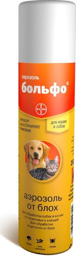 Аэрозоль Больфо является инсекто-акарицидным средством контактного действия, активным против блох, вшей, власоедов и иксодовых клещей, паразитирующих на собаках и кошках.