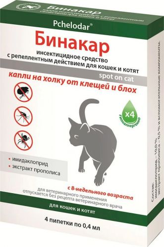 Бинакар – лекарственный препарат, предназначенный для уничтожения паразитирующих насекомых у животных.Действующие вещества: имидаклоприд, циперметрин, экстракт прополиса и вспомогательные компоненты.